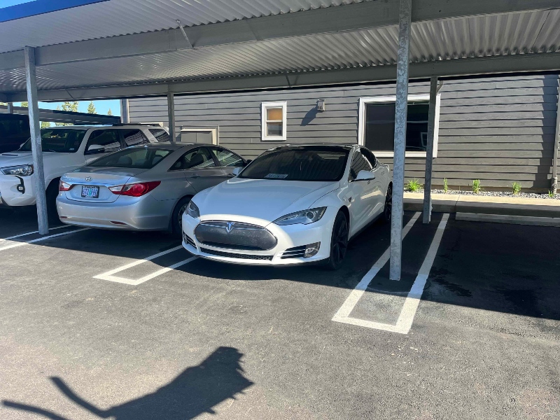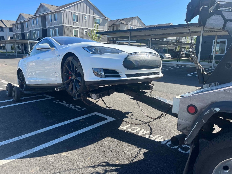 Baker & Baker Towing recently helped out in a car towing incident involving a 2012 Tesla Model S Performance. The vehicle was located in an apartment parking complex under a carport in Molalla, OR, and was rendered wholly powerless and immobilized. This Tesla presented a unique challenge due to its lack of power and the inability to activate the car towing mode.