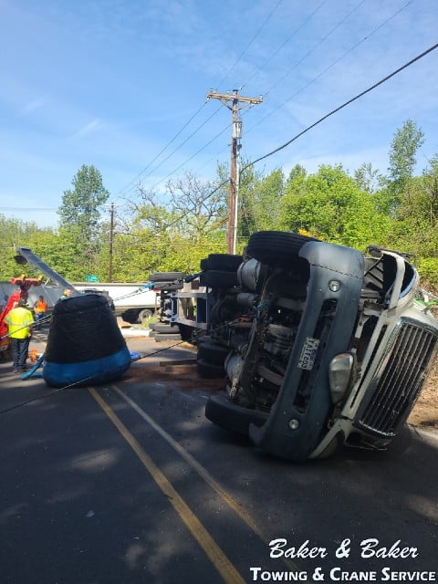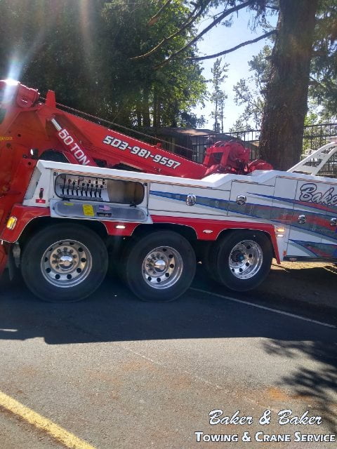 The heavy recovery team at Baker & Baker was called to the site of an accident in South Lone Elder Road in Canby, OR. A heavy recovery team with a heavy wecker and a medium wrecker was dispatched from 2874 Newberg Highway, Woodburn, OR 97071.