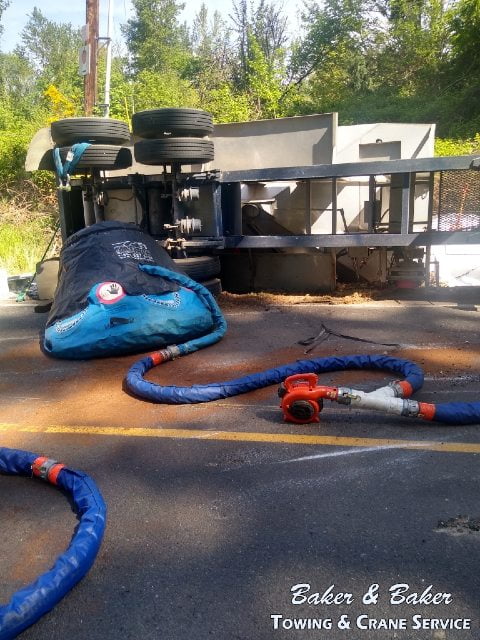A heavy recovery team was dispatched to the site of an accident on South Lone Elder Road in Canby, Oregon. A tractor carrying a hopper trailer full of fertilizer took a corner too quickly and immediately lost control. Unable to gain control of the truck, the driver was helpless as the truck overturned, sliding onto the shoulder of the road.